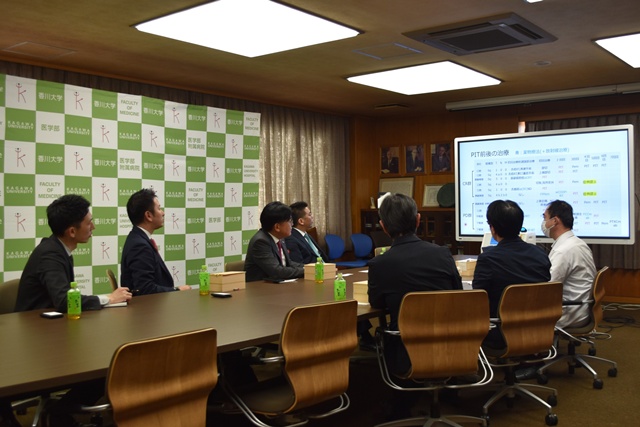昼食をとりながらの会談には、楽天メディカル株式会社からは三木谷会長、前田副会長、小玉社長、神田アルミノックス統括本部長(西日本エリア責任者)が、医学部からは西山医学部長、耳鼻咽喉科・頭頸部外科の星川教授及び岸野講師が出席しました。