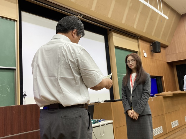 令和6年7月2日(火曜日)に医学部臨床講義棟2階で開催された「令和6年度 第2回(通算 第31回)香川大学医学部リサーチ・クロストーク」において、大学院医学系研究科医学専攻の大学院生、李 高鵬さんと叶 娟娟さんが優れた学術成果を発表され、医学部長より「Best Presentation Award」が贈呈されました。なお、令和6年度第1回のリサーチ・クロストークでは、大学院医学系研究科医学専攻の井上依里さんとNafisa Tabassumさんの2名が「Best Presentation Award」を受賞されています。