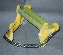 また、がんの手術において骨を一部切除しなくてはいけない場合には、とりわけ緻密な術前計画が必要となります。この点、香川大学形成外科においては、術前に撮影したCTに基づき3次元立体模型を作製し、術前シミュレーションを行って切除・再建を行っています(図5~7)。チタンプレートや腓骨(足の骨)・腸骨〈腰骨〉等を用いて顎の再建を行っています。