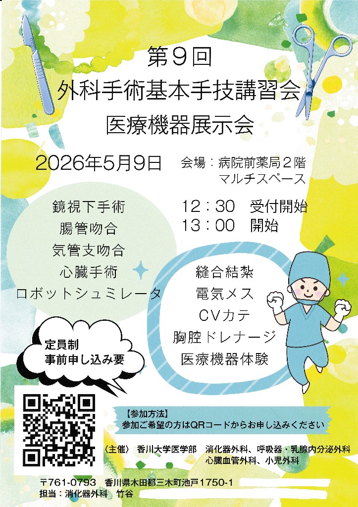 【5月開催】講習会のお知らせです香川大学では、外科系診療科合同で外科手術基本手技講習会を年2回開催しています。