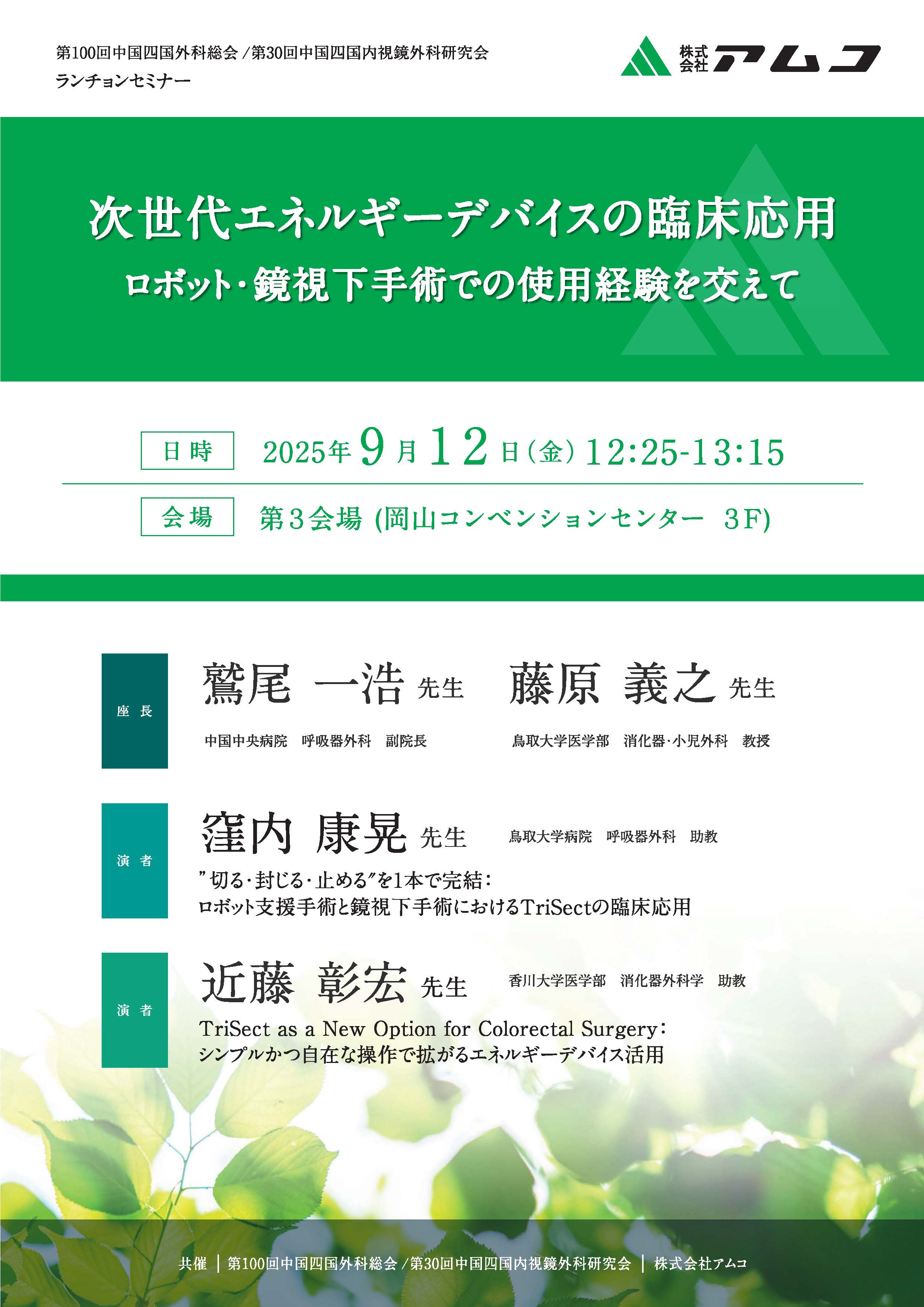 お知らせ 2025/9/12第100回中国四国外科学会、第30回中国四国内視鏡外科研究会 ランチョンセミナー 2025年9月11日、12日に第100回中国四国外科学会、第30回中国四国内視鏡外科研究会が開催されます。12日のランチョンセミナー6で、株式会社アムコ共催のもと「次世代エネルギーデバイスの臨床応用 〜ロボット・鏡視下手術での使用経験を交えて〜」が開催予定です。当科 助教 近藤彰宏が演者として登壇いたします。 一覧へ戻る
