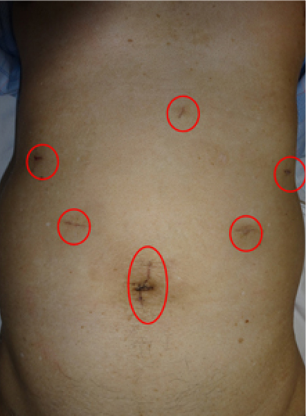 お腹に数箇所の孔(5mm~12mm程度)から行うため、