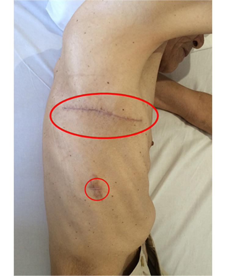 従来、開胸(胸を大きく開け、肋骨切離を伴う)と開腹(心窩部から臍までの大きな傷)で行っていた食道癌手術は、長時間に及び、患者様にとっては非常に高侵襲です。香川大学では、その負担を軽減するために、切除も再建もカメラによる手術(胸腔鏡、腹腔鏡)を行うことで、肋骨切離の必要がなく、手術の傷も最小限で、術後のリハビリが早く進み、肺炎などの術後合併症の軽減につながっています。